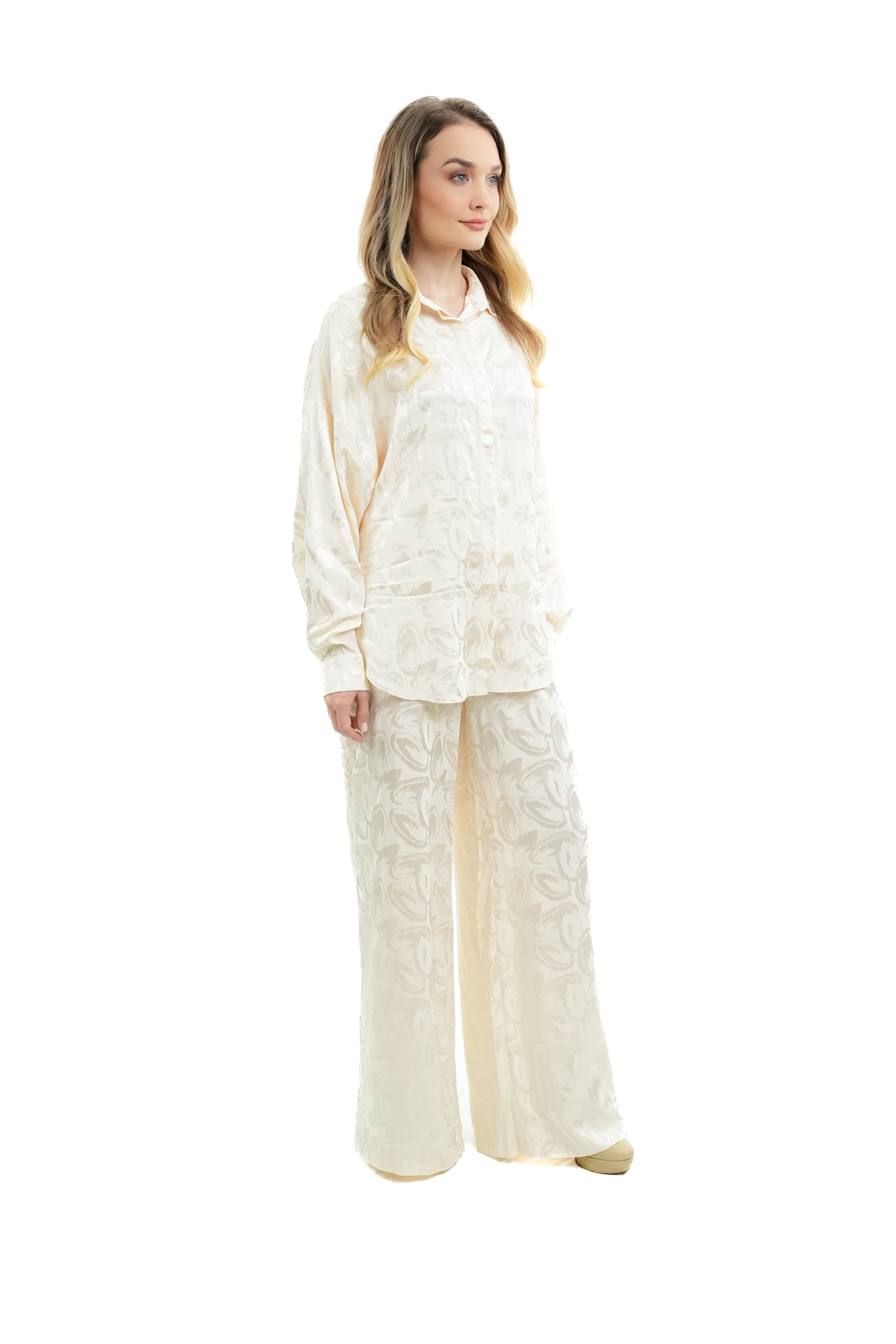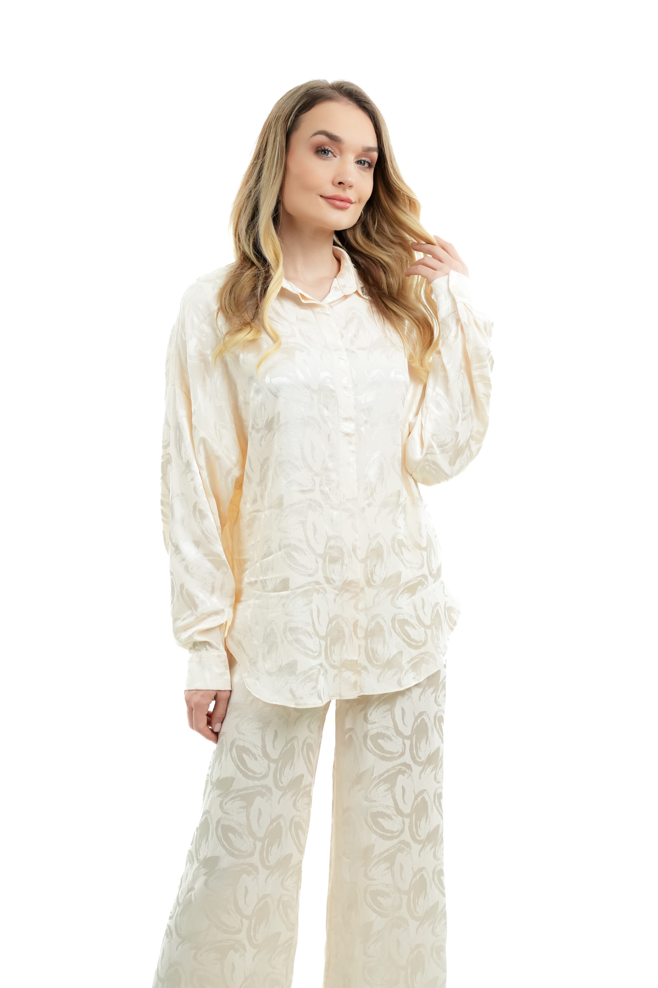 - Satin shirt with a subtle textured leaf pattern